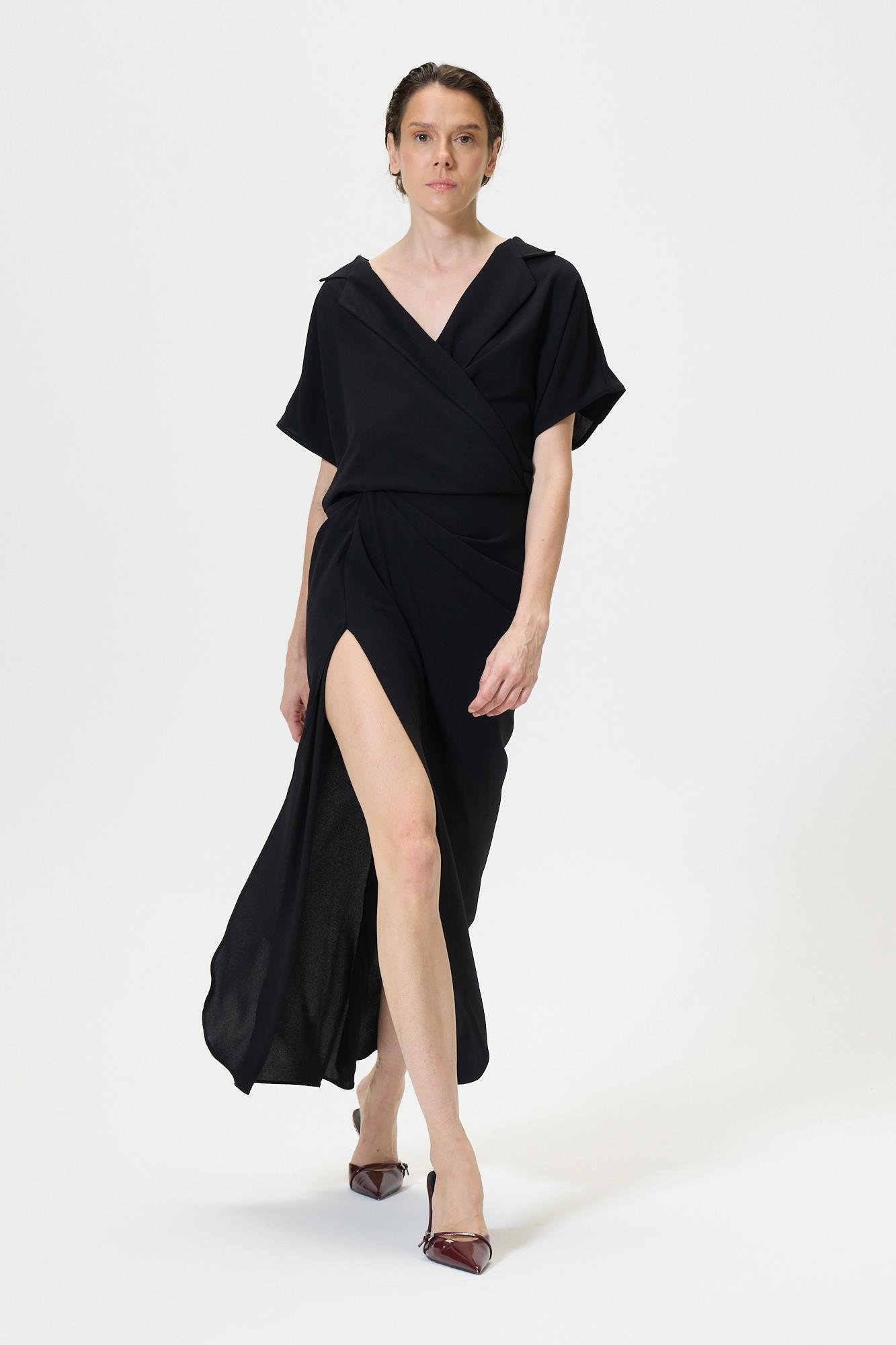 Kruvaze Yaka Önden Yırtmaçlı Elbise