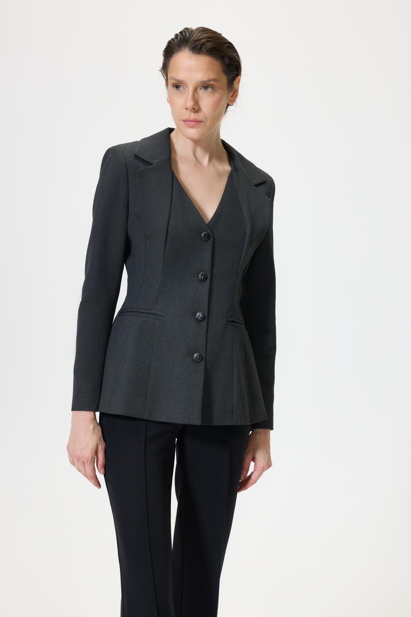 Modern çizgilerle yeniden yorumlanan Teressa Ceket, yelek görünümlü erkek yakası ve normal kapamalı tasarımıyla sofistike bir stil sunuyor. Ön kısmındaki fleto cep detayı ve bele oturan kalıbı, vücudu zarifçe öne çıkararak feminen bir silüet yaratıyor. %98 pamuk %2 elastan kumaşıyla konforlu bir kullanım sağlayan bu şık ceket, hem iş ortamında hem de özel günlerde tercih edilebilir. İster pantolonlarla takım halinde, ister etek veya jeanlerle tek başına kombinleyerek farklı tarzlar yaratabilirsiniz. Pembe ve bordo renk alternatifleriyle gardırobunuza güçlü bir dokunuş katın. BEDEN ÖLÇÜ BİLGİSİ: Göğüs; XS: 93cm, S:97cm, M:101cm, L:105cm Bel: XS: 68cm, S:72cm, M:76cm, L:80cm Ön omuzdan boy :67-68,5 cm dir. Mankenin giydiği beden XS'tir. Mankenin Boy: 1.78 cm Ölçüleri: 78/67/ 93 cm